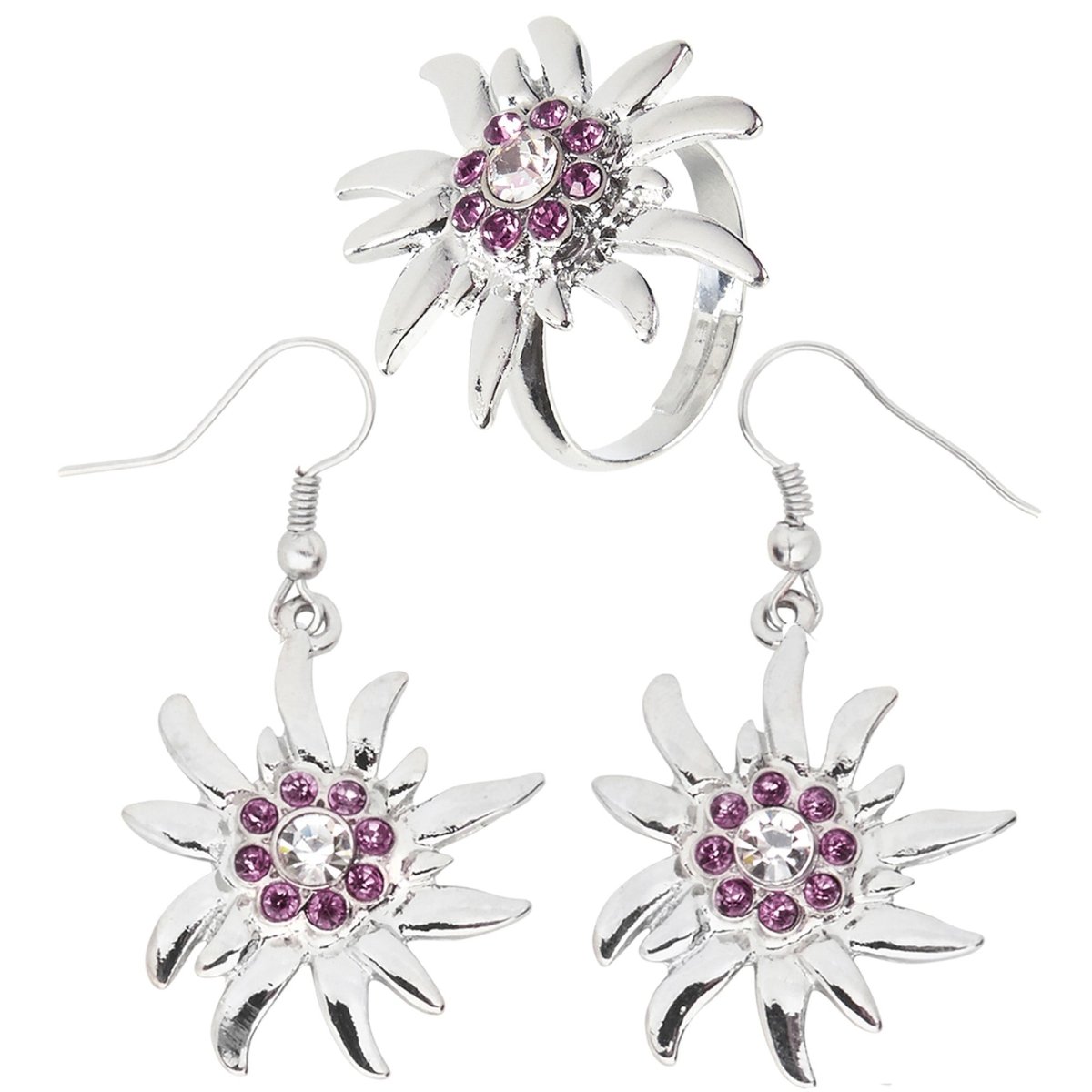 Oktoberfest-tilbehørssæt Pink sølvøreringe og ring