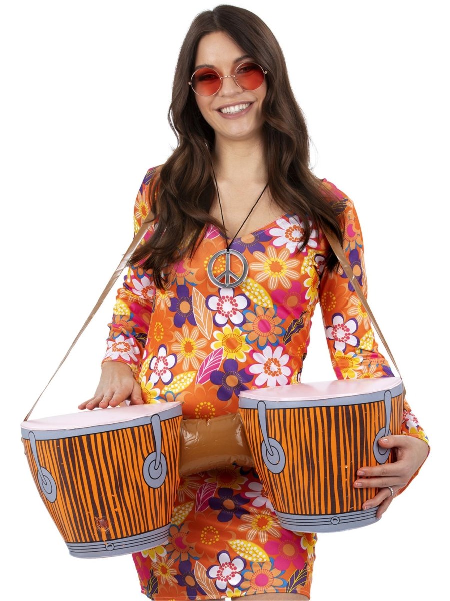 Bring flowerpower-stemningen til live med disse oppustelige hippie-bongotrommer! Med deres muntre udseende er de perfekte som tilbehør til fester med 60'er/70'er-tema, karnevaler, festivaler eller frække fester. Takket være det lette, oppustelige design og den medfølgende skulderrem kan du nemt have dem med overalt.