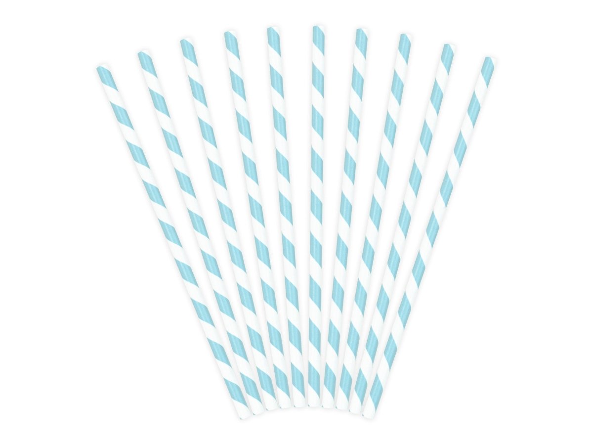 Indhold: Papirsugerør, himmelblå med helede, hvide striber, længde ca. 19,5 cm. (1 HPT/10 stk)