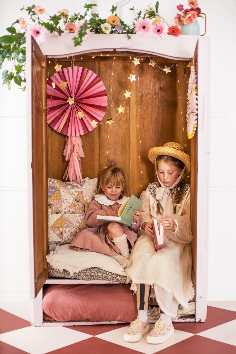 Dekorative rosetter Blomster, blanding af farver, lavet af lyserødt papir med frynser, diameter efter samling ca. 26 cm, 35 cm, 43 cm.