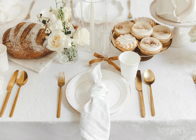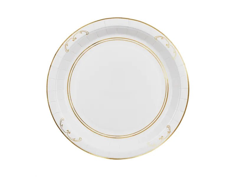 Giv dit festbord et stilfuldt look med disse runde papirtallerkener. Den hvide tallerken med gulddetaljer giver et elegant touch og er ideel til fødselsdage, konfirmationer, bryllupper eller andre festlige lejligheder.