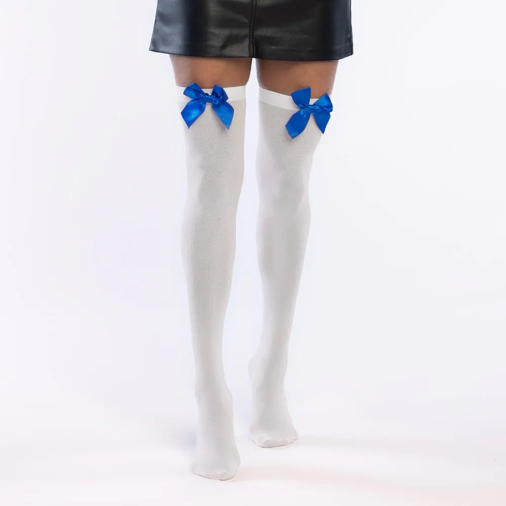 Disse hvide strømper med satinblå sløjfer vil give dit outfit et muntert og ondskabsfuldt twist. Ideel til udklædning som skolepige, eventyrfigur eller hvis du bare elsker iøjnefaldende detaljer - denne accessory vil med garanti stjæle opmærksomheden!