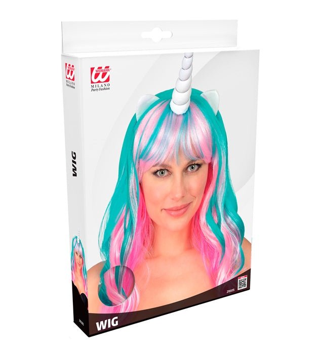 Denne enhjørningsparyk er et komplet tilbehør til kostume- eller festformål.