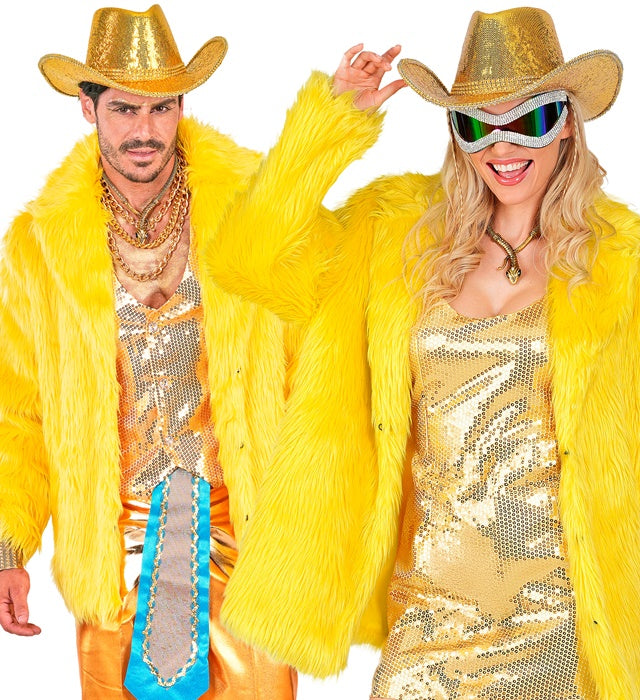 Denne pjuskede pelsfrakke i en munter gul farve er et ægte blikfang og perfekt til et iøjnefaldende og festligt outfit. Ideel til karneval, temafester, 80'er/90'er-fester eller en forkert fest.