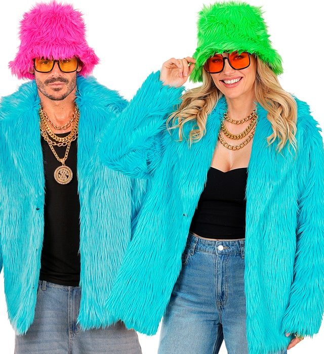 Denne pjuskede pelsfrakke i turkis er et friskt og iøjnefaldende blikfang, perfekt til et festligt og farverigt outfit. Ideel til karneval, temafester, 80'er/90'er-fester eller en forkert fest.