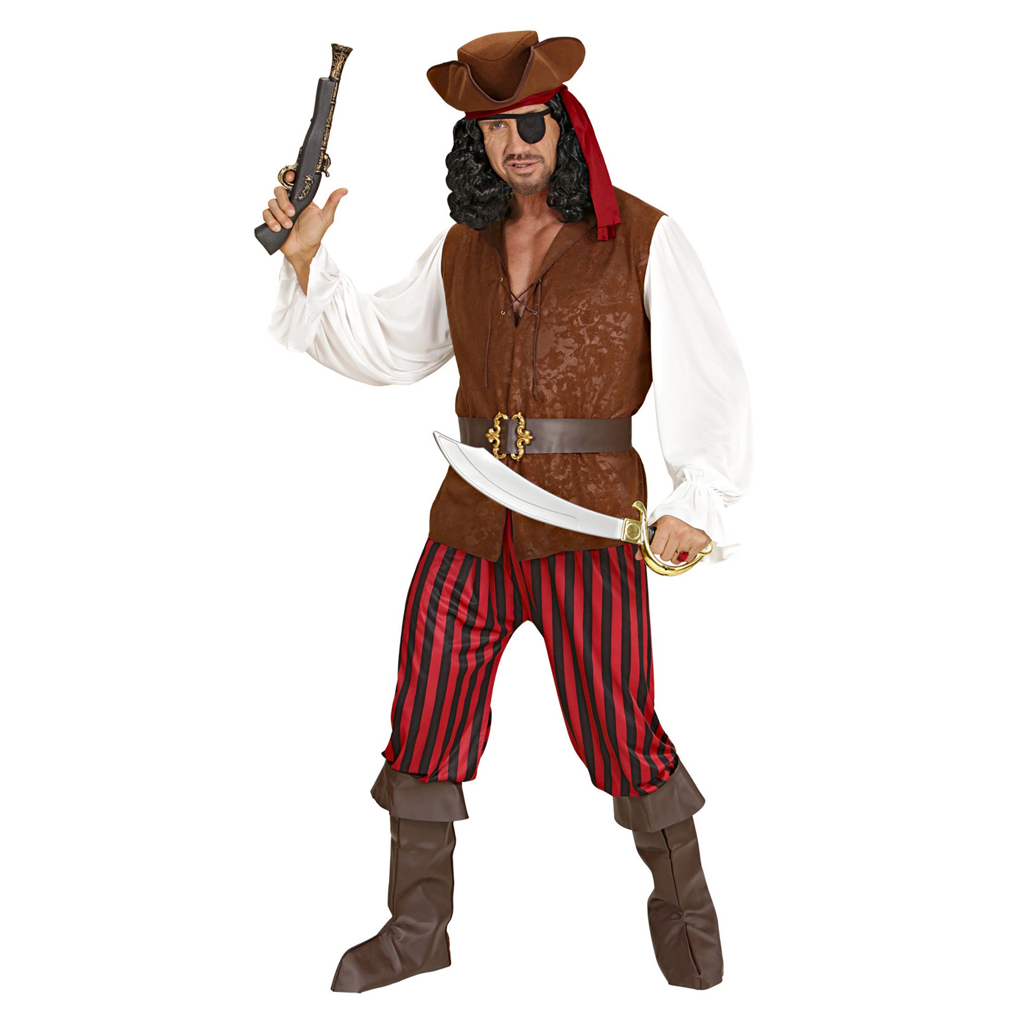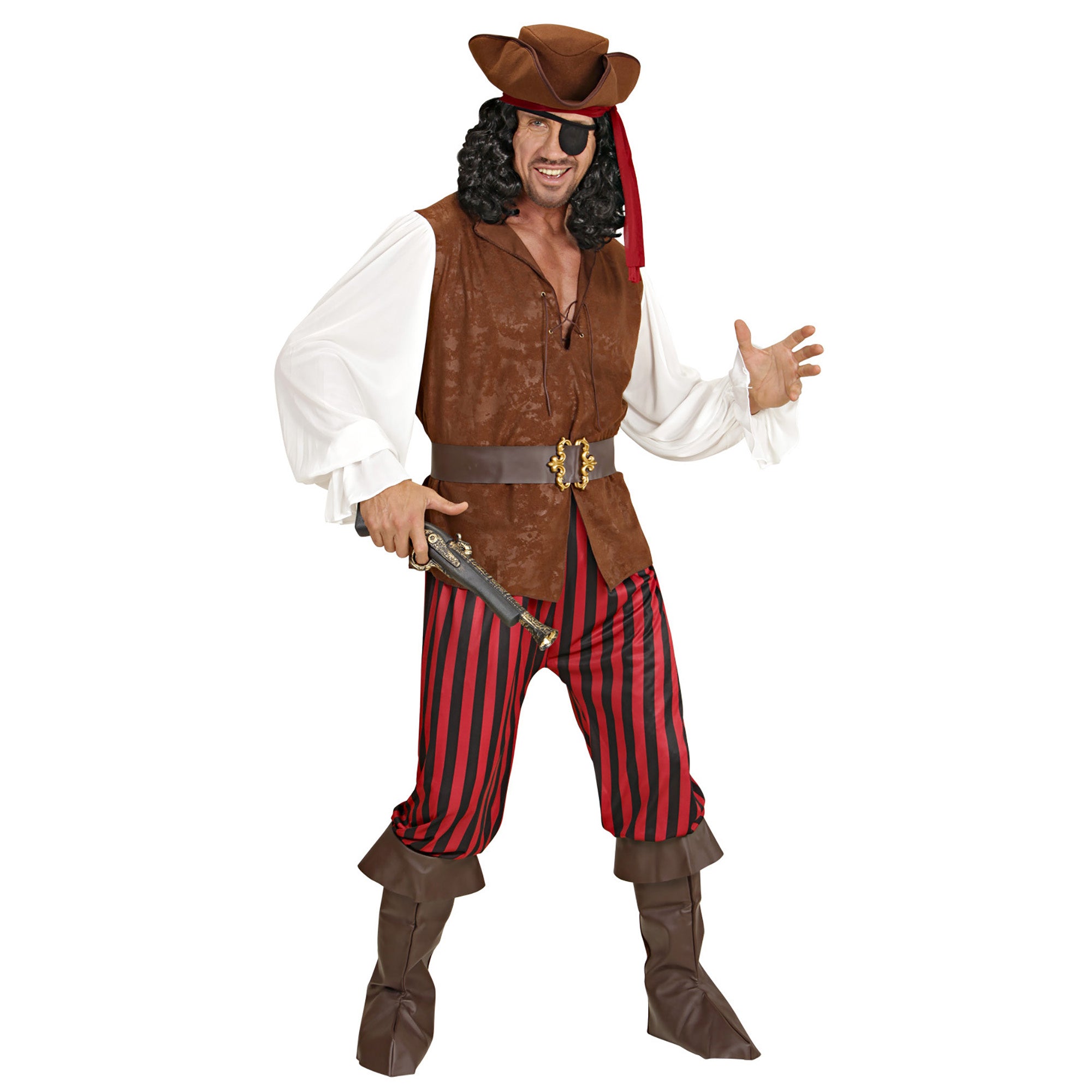 Beskrivelse: piratskjorte med vest, bukser, bælte, støvlebeskyttere, pandebånd, hat, klap for øjet