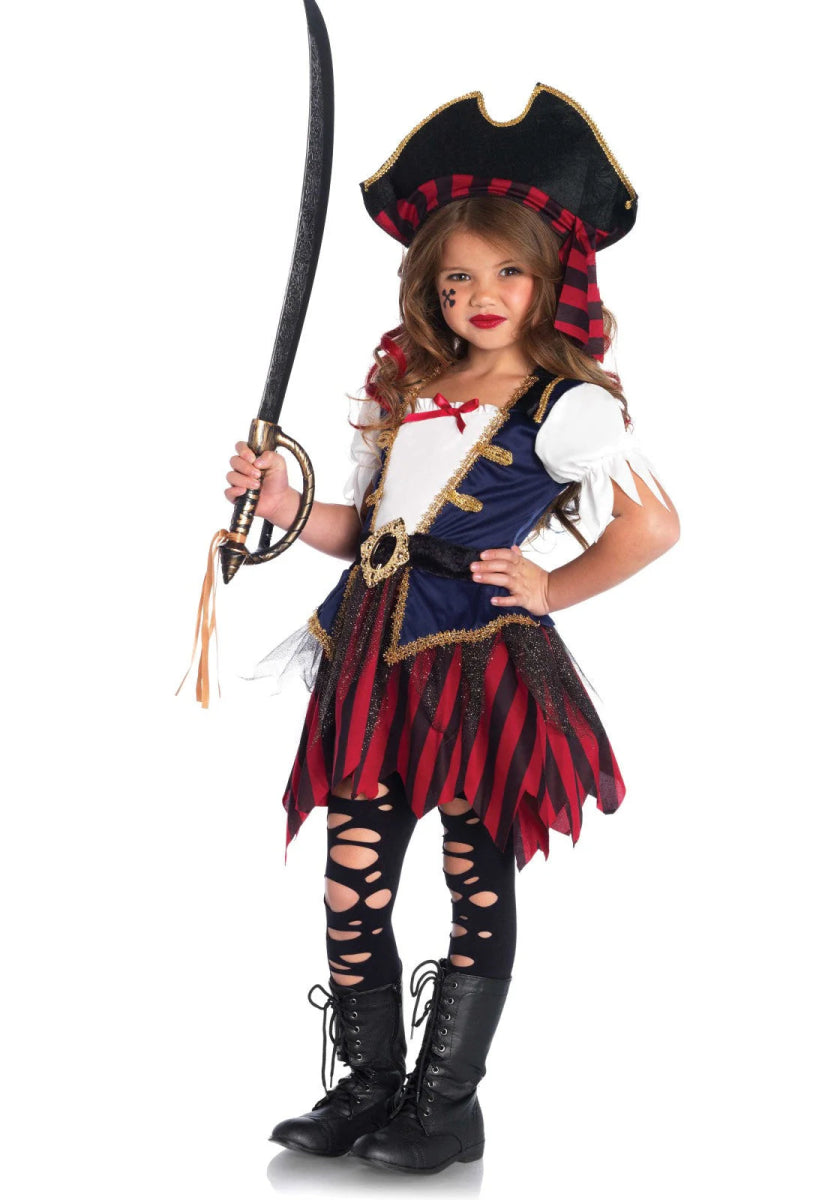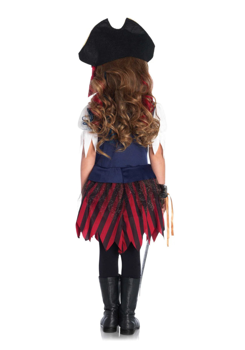 Små piger bliver store eventyrere i dette Caribiske piratkostume. Dette piratsæt i to dele indeholder en guldbesat kjole med fastgjort bælte og en matchende pirathat med tørklæde. Perfekt til at blive kaptajn på dit eget skib! ⚓🌊