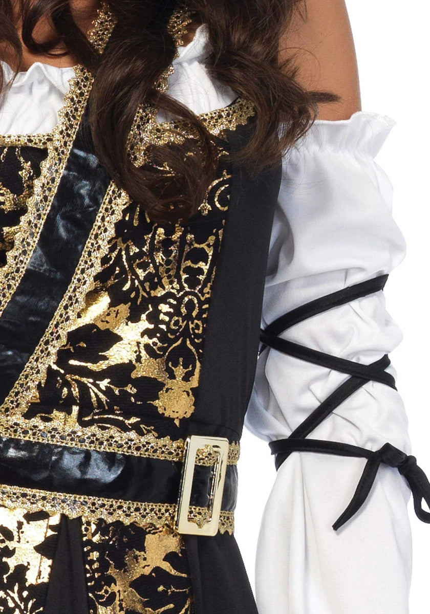 Sæt sejl ind i det ukendte med det 4-delte Black Sea Buccaneer piratkostume fra Leg Avenue! Dette dristige og forførende kostume består af en sort kjole med brocante gulddetaljer og en lynlås bagpå, løse ærmer med snore, et crossbody-bælte og en klassisk pirathat. Dette kostume er perfekt til halloween, karneval eller fester med pirattema, og det vil gøre dig til den ultimative pirathersker! 🖤✨