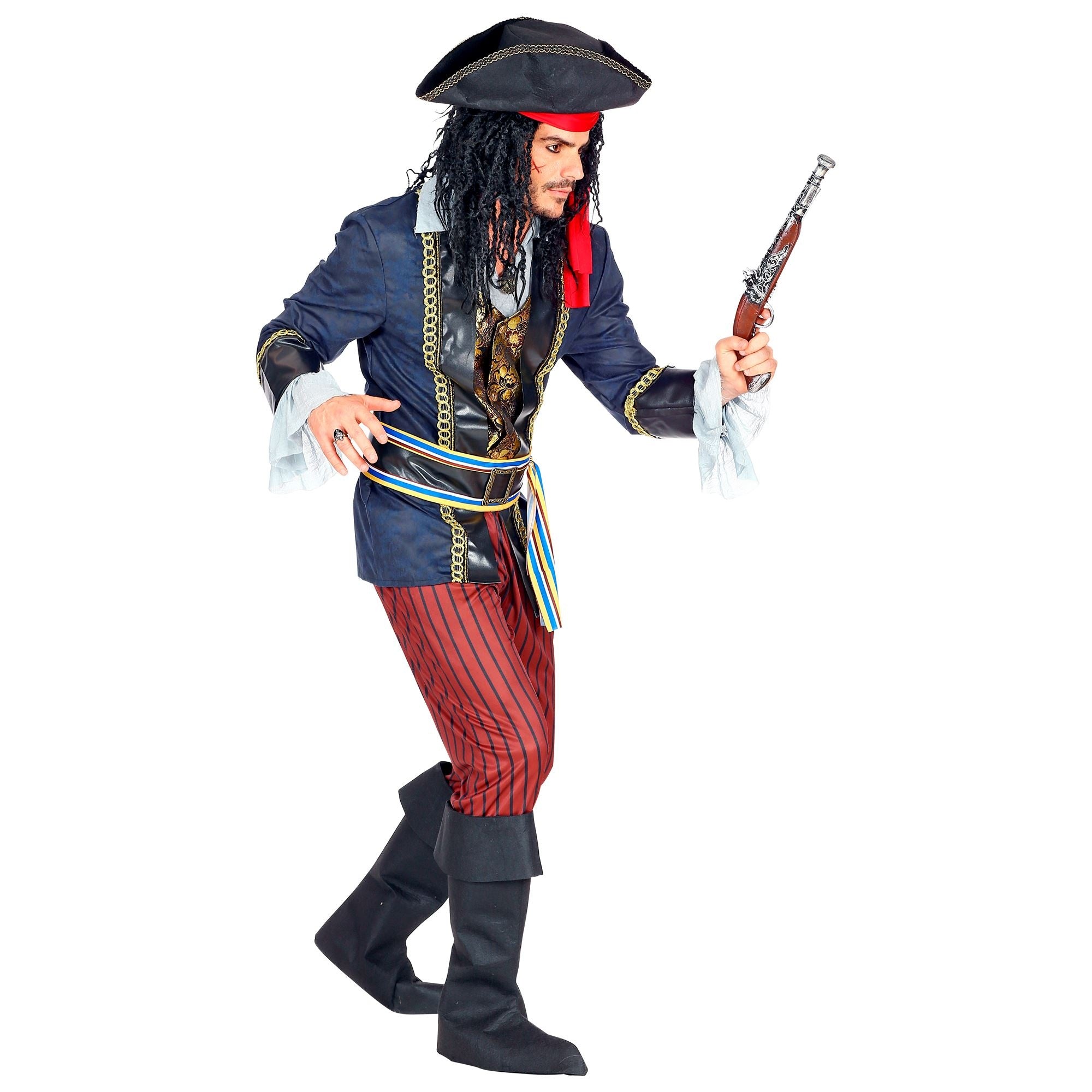 Beskrivelse: piratkaptajnjakke med vest & skjorte, bukser, bælte med spænde & skærf, støvleovertræk, hat med bandana