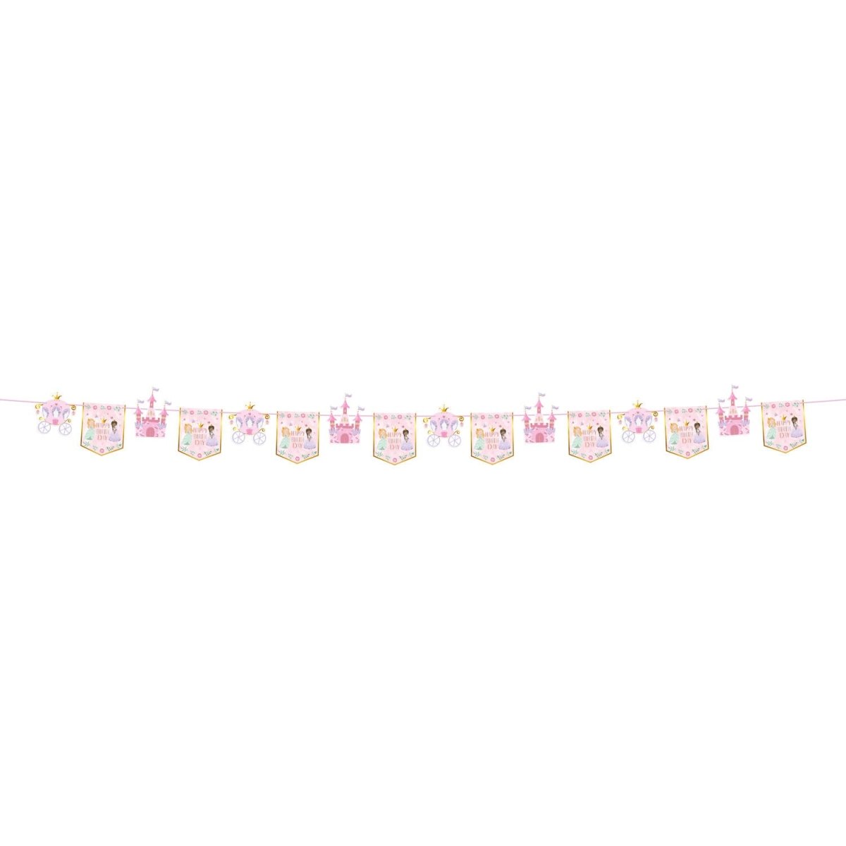 Til fortryllende prinsessefester. Flagline - Pretty Princess - 6 meter. Indhold: 1 flagline. Kan f.eks. bruges til følgende fester/anledninger: Børnefødselsdag, fødselsdag. Dette bliver virkelig en fest for prinsesser! Der er 16 flag på ca. 17 x 21 cm på denne 6 meter lange flagline. Der er 3 typer flag: et lyserødt flag med teksten "HAPPY BIRTH DAY" og to prinsesser, et i form af et slot og et i form af en vogn. Alle flagene har en smuk gulddetalje, som virkelig skinner takket være den anvendte hot-stamping-teknik! Flagene er trykt på begge sider. De kan skubbes frem og tilbage over det rosa bånd. Denne flagserie hører til Pretty Princess-kollektionen af