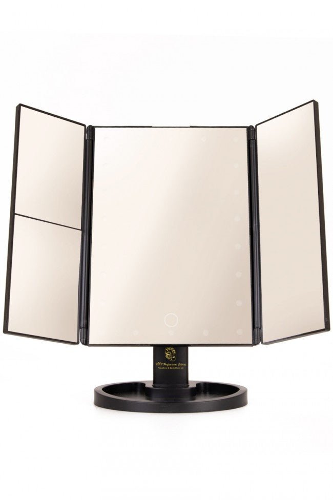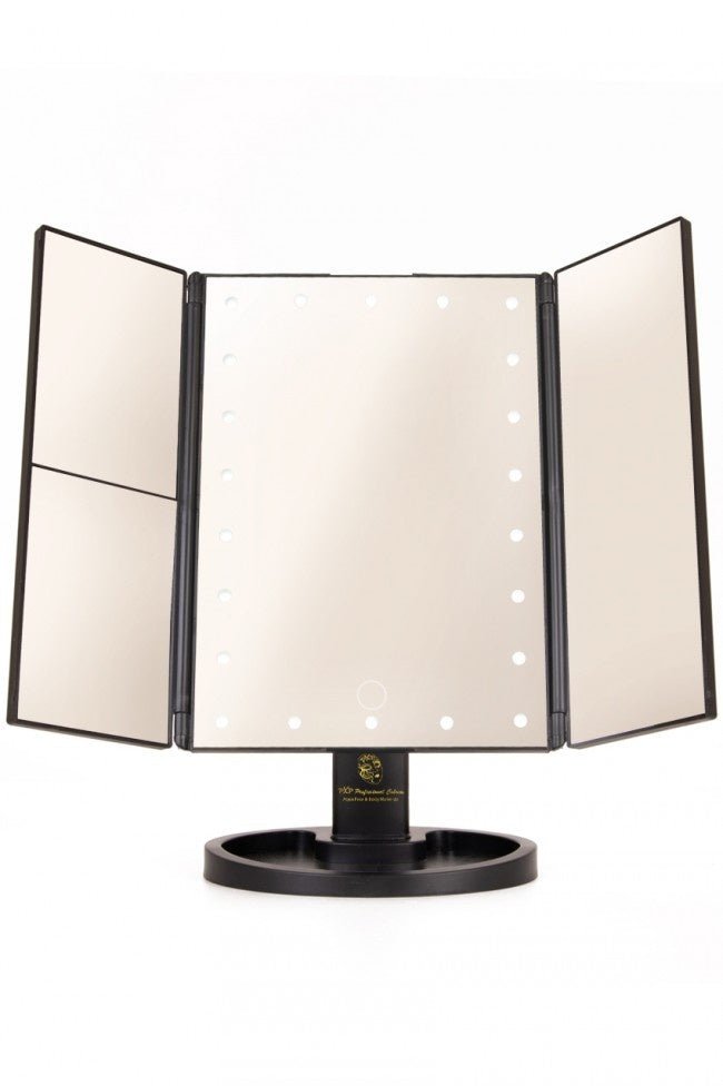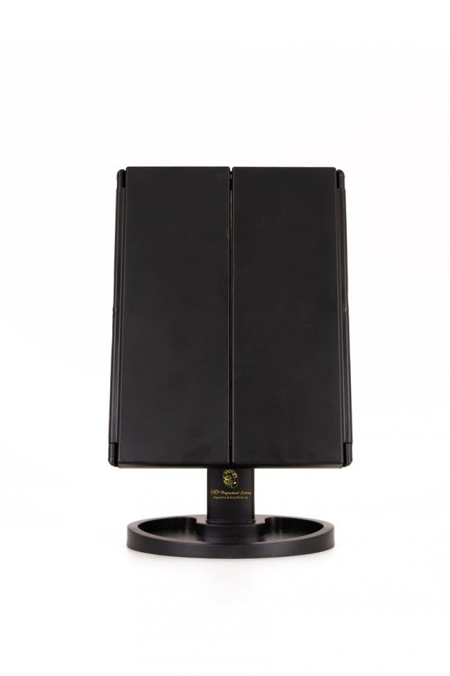 Med dette Illuminated Mirror vil din makeup/makeup altid sidde lige i skabet fra nu af. Spejlet har LED-belysning, så dit ansigt altid er perfekt oplyst, og du aldrig går glip af en detalje. Designet med tre paneler gør spejlet sammenklappeligt og nemt at bære. Belysningen kører på 4 AAA-batterier, så du kan placere spejlet hvor som helst, men du kan også tilslutte det til et USB-kabel. Dimensioner: - 35 cm x 28,5 cm x 11,5 cm Farver: - sort Materiale: - plast - spejl/glas Led-belysning - 4x AAA-batteri (ekskl.) - eller via USB-forbindelse (inkl.) Emballagemål: -29 cm x 19 cm x 7 cm Anden info: - 180¡ rotationsfunktion - brug stående eller liggende - 22 kraftige LED-lys - 2x og 3x forstørrelse - Praktisk bakke til makeup m.m.