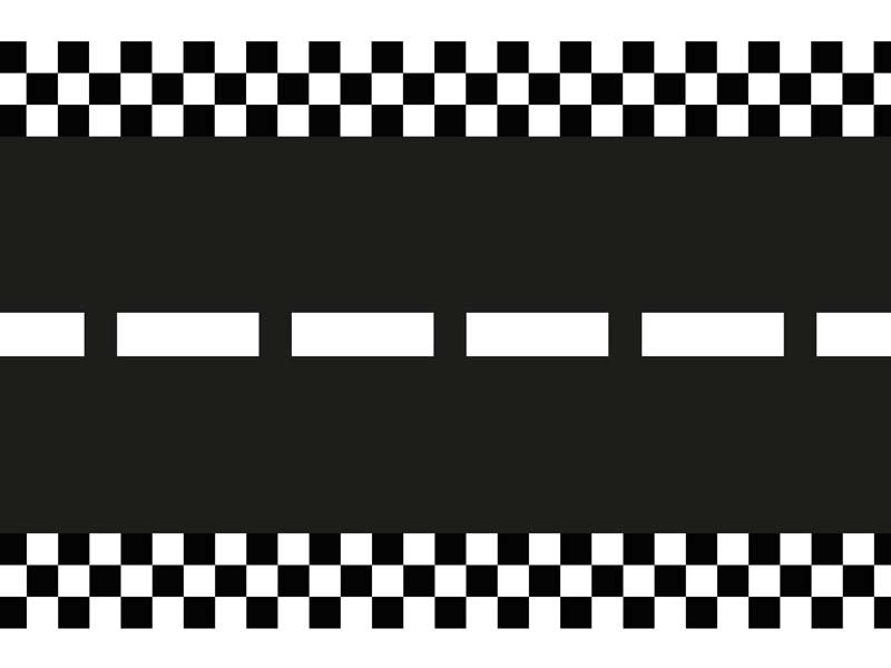 Filttæppe med sort-hvidt print af en racerbane. Bredde ca. 40 cm, længde ca. 5 m.