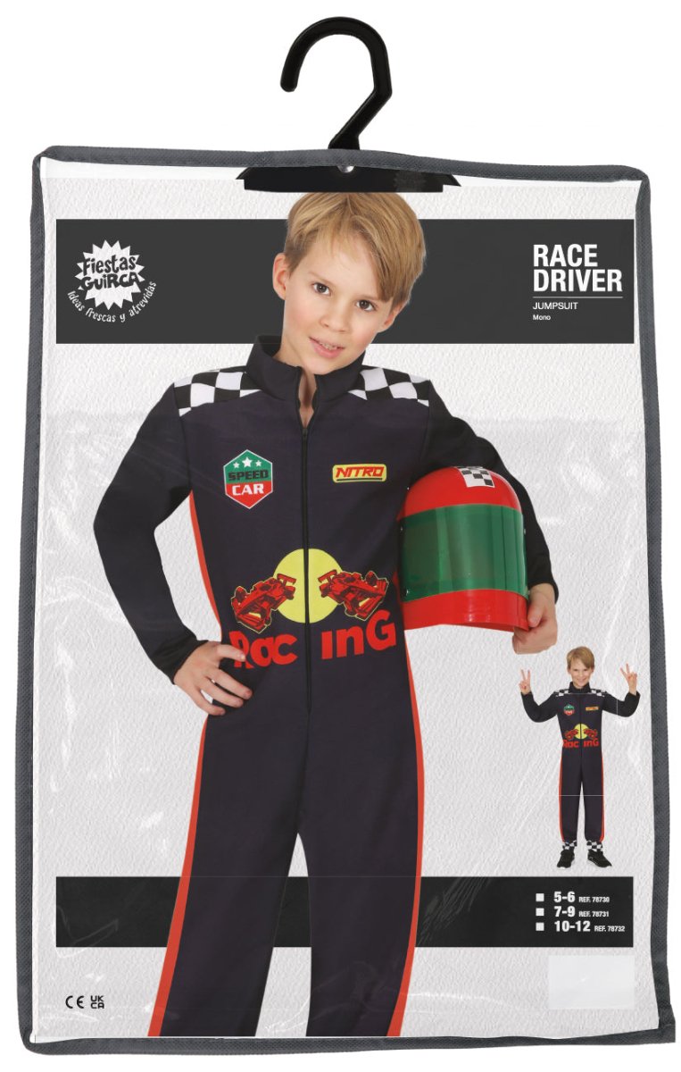 Lad børnene påtage sig rollen som en rigtig racerkører med denne seje racerdragt. Ideel til karneval, udklædningsfester eller kostumefester. Kostumet består af en behagelig heldragt i let og smidig polyester, som gør det behageligt og giver masser af bevægelsesfrihed under legen.