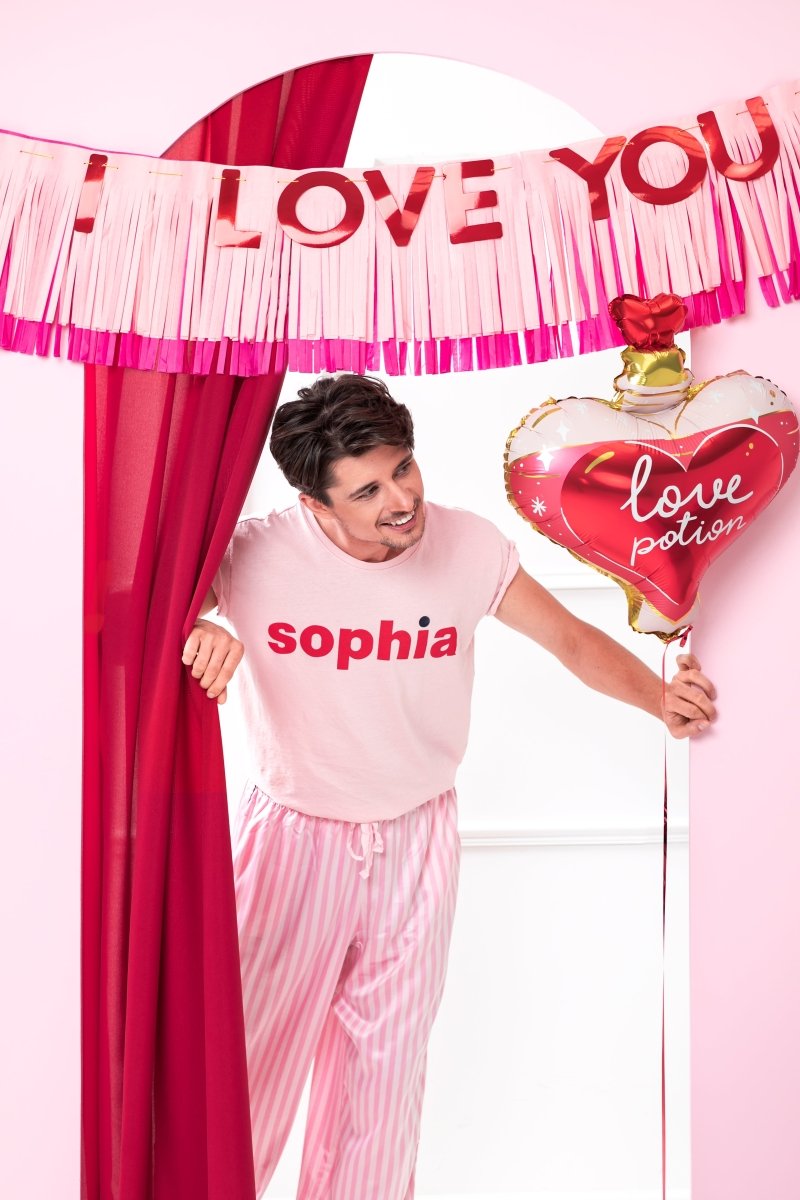 Banner I Love You lavet af silkepapirfrynser i pink farve og bogstaver i metallic rød farve, størrelse ca. 150 x 30 cm, længde på reb ca. 2,5 m.