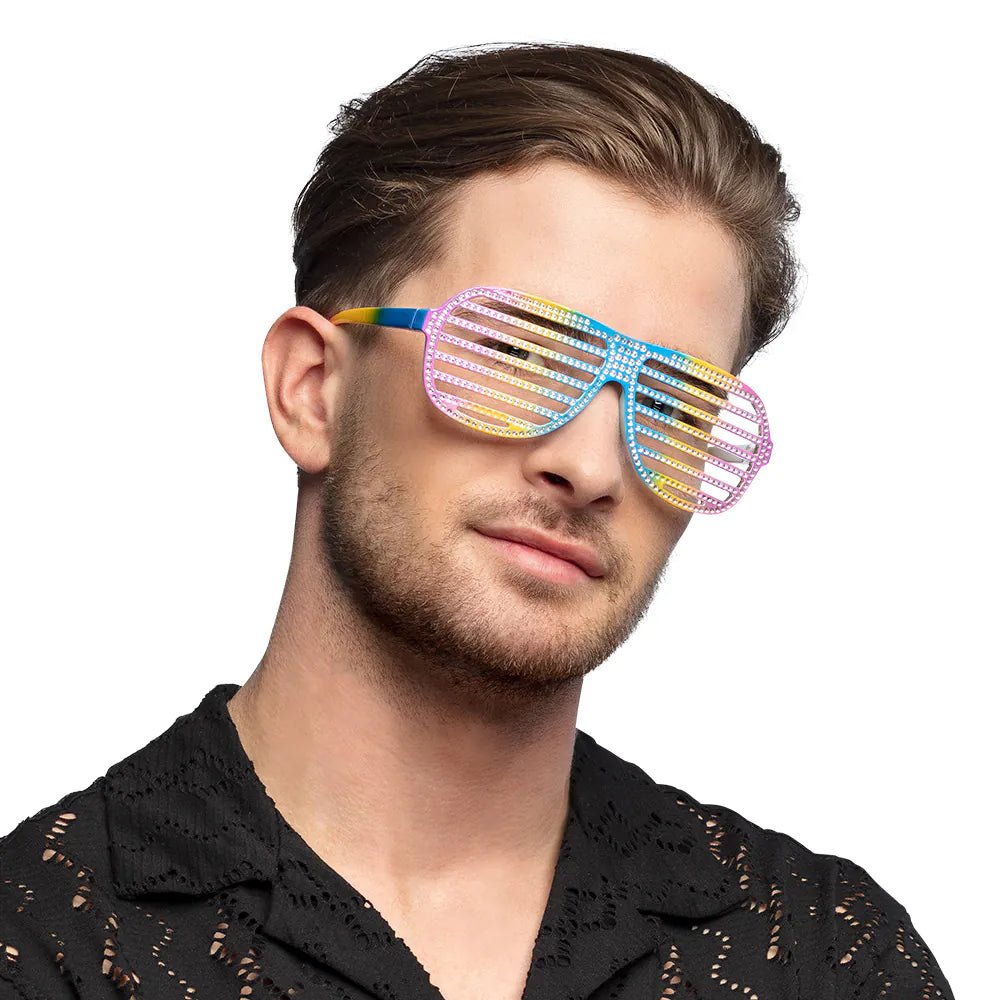 En farverig shutter-partybrille til festivalgæster, festaber og 90'er-fanatikere. De seje shutter-briller har muntre regnbuefarver og er dekoreret med skinnende sten for et glamourøst touch. Et sjovt tilbehør til et retro 90'er-outfit til karneval, en mistake party eller en udklædningsfest.