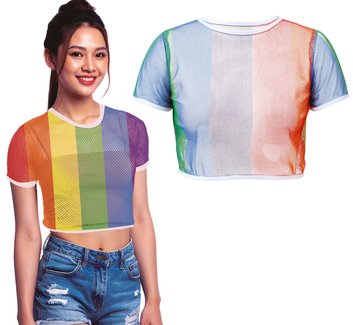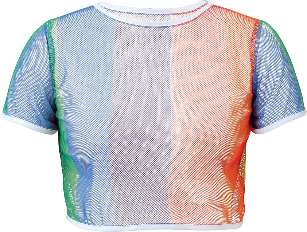 Skil dig ud med denne farverige Rainbow Mesh T-shirt. Det gennemskinnelige mesh-stof og de levende regnbuefarver gør denne T-shirt perfekt til festivaler, temafester eller et iøjnefaldende streetwear-look.