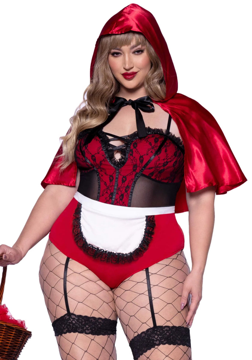 Ulven vil helt sikkert finde dig i dette dragende Frække Rødhætte Plus Size-kostume fra Leg Avenue! Dette fortryllende 3-delte ensemble omfatter en blondebøjle-teddy med gennemsigtige detaljer og en ekstra fræk pasform, et blondeforklæde og en satinhættekappe med sløjfelukning. Perfekt til en eventyrlig halloween- eller karnevalsfest! 🌲✨