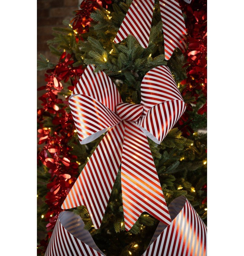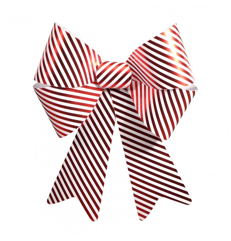 Skab en munter og festlig stemning i dine dekorationer med denne store PVC-sløjfe med slikstriber. Dens iøjnefaldende størrelse og klassiske røde og hvide striber gør denne sløjfe ideel til juledekorationer og gaver.