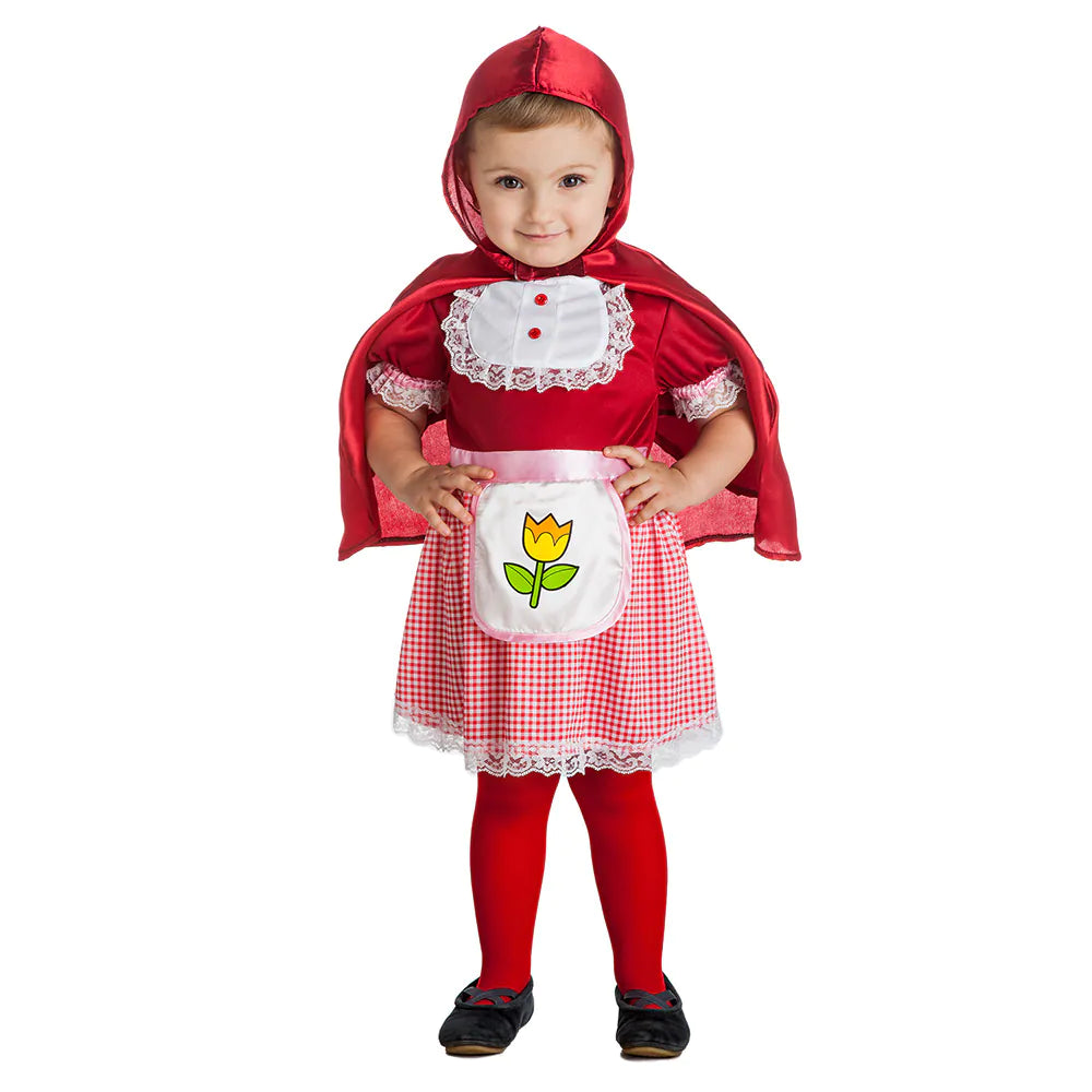 Det søde Rødhætte-børnekostume til piger består af en sød rød kjole med forklæde og en matchende rød kappe med hætte. Et komplet eventyrligt kostume, som får små piger til at stråle som den modige pige med den røde hætte til karneval, børnefødselsdag eller udklædningsfest. Også meget fint at give som gave