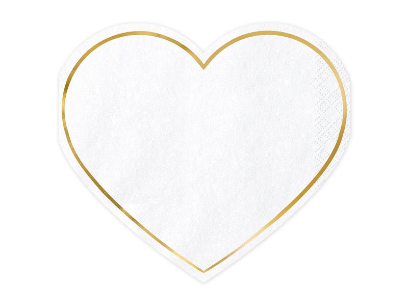 Hjerteformede papirservietter i hvid farve med metallic guldprint, størrelse efter udfoldning ca. 28,5 x 25 cm, størrelse efter foldning ca. 14,5 x 12,5 cm.