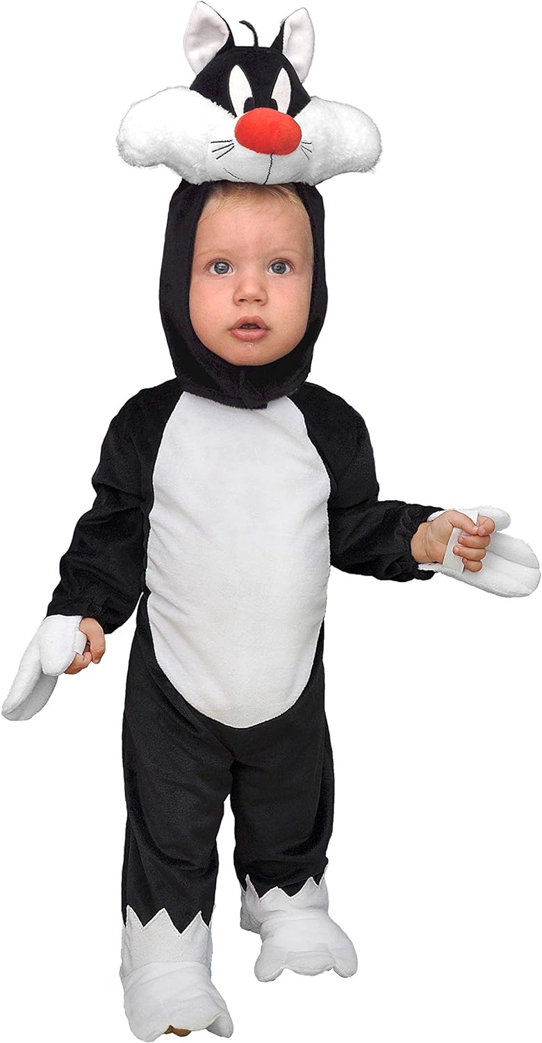 Dette Silvestro the cat-kostume til babyer er et muntert og genkendeligt sæt i sorte og hvide farver. Figuren er kendt fra Looney Tunes og gør dette kostume ekstra sjovt til karneval, udklædningsfester eller en legende fotosession.