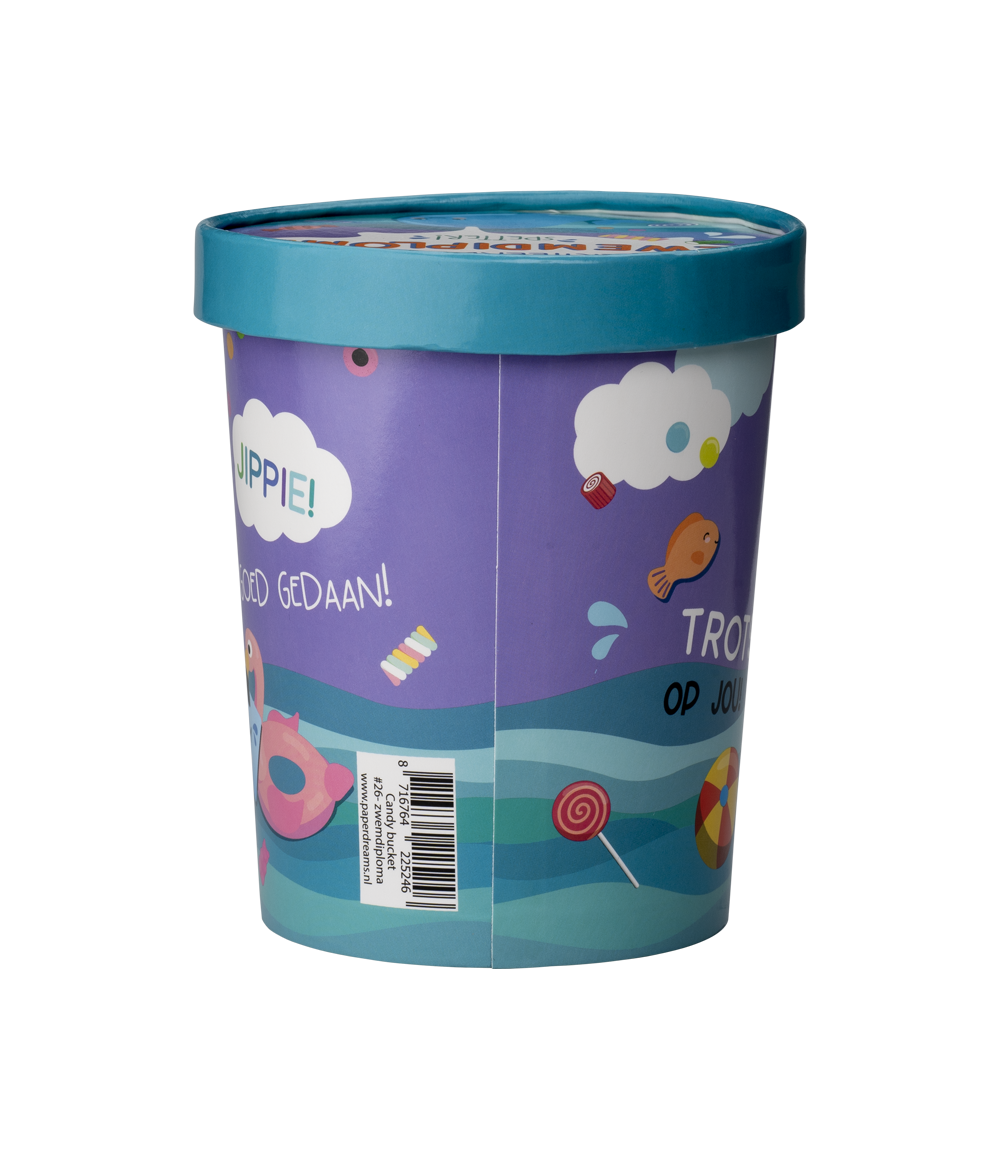 De muntre slikspande er et rigtigt blikfang i butikken. Blandt andet på grund af det sjove design er denne slikspand meget rar at få. Slikspandene er lavet af pap!