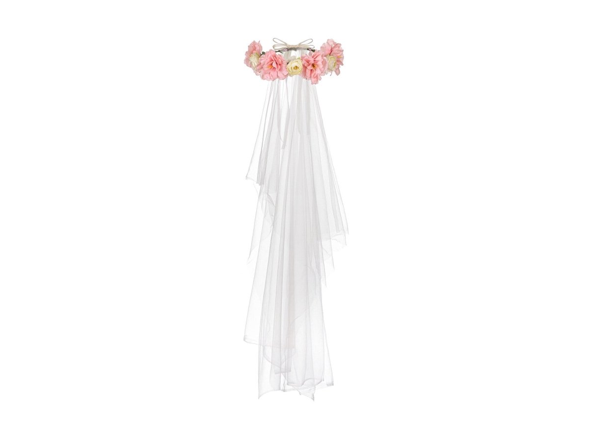 Krans met bloemen in roze en crème met witte sluier, diameter ca. 17 cm.