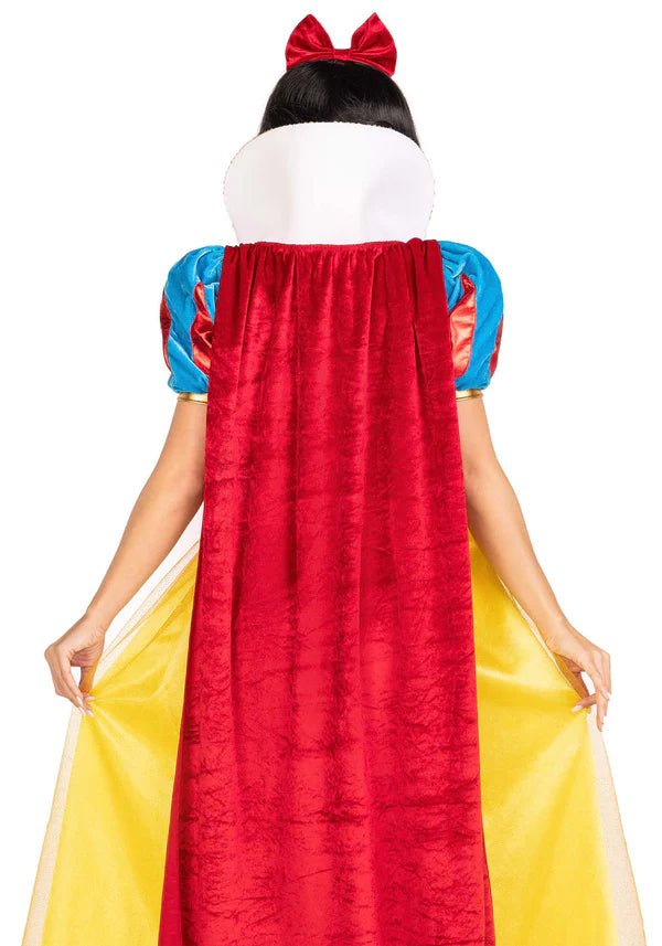 Oplev eventyrets magi med dette fortryllende 3-delte Deluxe Snehvide-kostume! Dette elegante ensemble omfatter en klassisk balkjole i fløjl og satin med flettede guldkanter og en majestætisk ståkrave. Den aftagelige fløjlskappe giver et royalt touch, mens det søde sløjfehovedbånd fuldender dit prinsesselook. Perfekt til udklædningsfester, eventyrtemaer eller til at genopleve din yndlingshistorie! 🌟💖