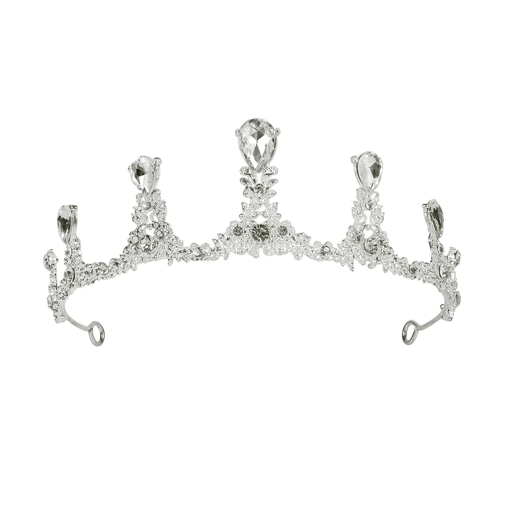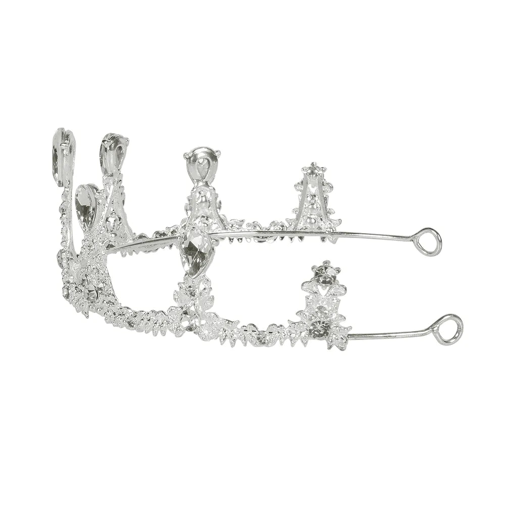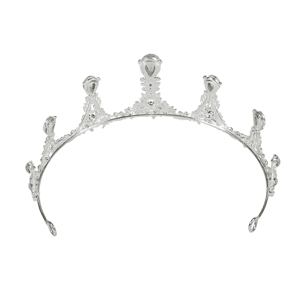 En kongelig tiara i sølvfarvet metal. Et smukt tilbehør til et royalt outfit som dronning eller eventyrprinsesse til karneval eller til at give et royalt touch til et bryllup. Diademet har et udsmykket design med diamanter.