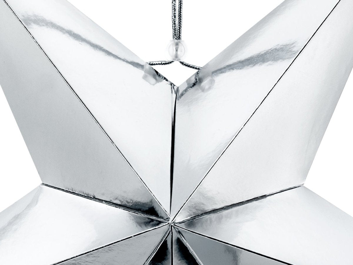 Indhold: Papirstjerne, femtakket, lavet af spejlsølvpapir, med sølvsnor, diameter ca. 70cm. Gør det selv-produkt.