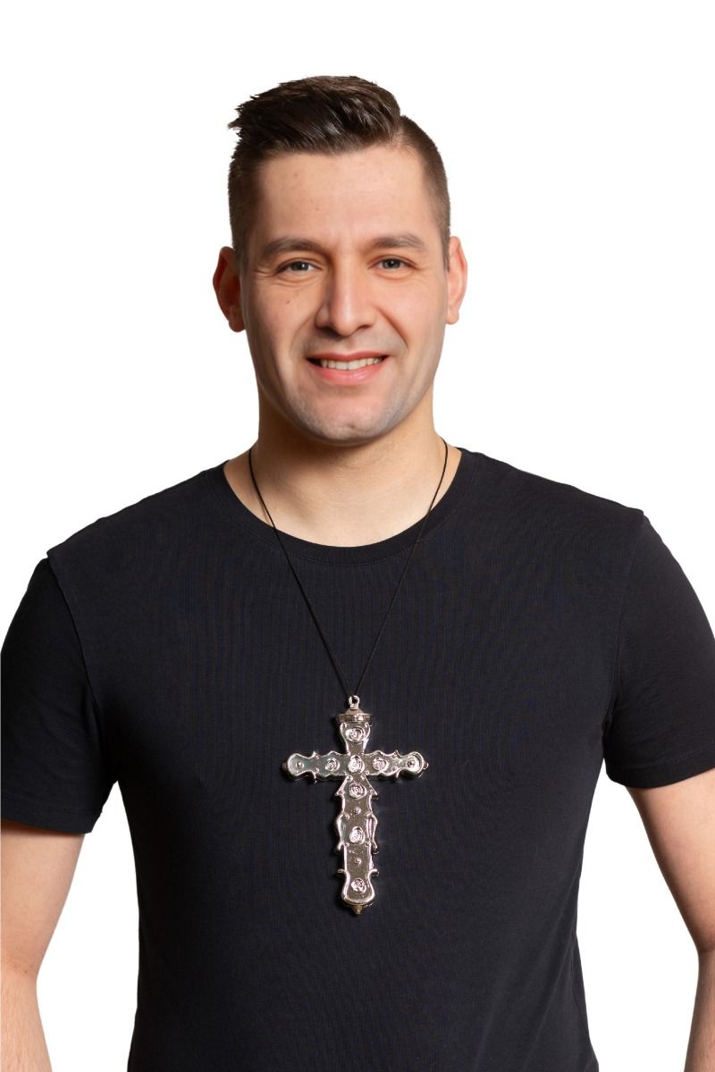 Silver Cross-halskæden er et stilfuldt og iøjnefaldende tilbehør, der passer perfekt til en række forskellige kostumer og tema-outfits. Ideel til at tilføje ekstra glans til et outfit under karneval, udklædningsfester og andre festlige lejligheder.