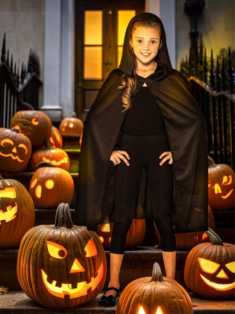 Denne lange sorte kappe med hætte er et alsidigt tilbehør, der passer perfekt til forskellige kostumer, f.eks. vampyr-, troldmands- eller fantasy-outfits. Det behagelige polyestermateriale gør kappen behagelig at have på til enhver fest eller begivenhed.