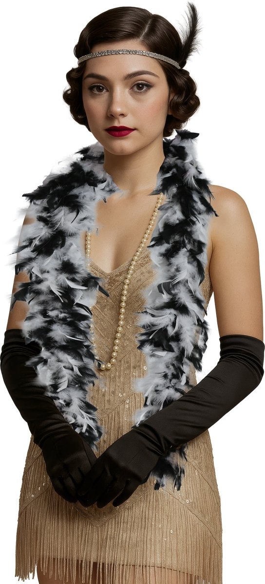 Fuldend ethvert outfit med denne elegante sort-hvide fjerboa. Perfekt til fester, temaaftener, teaterkostumer eller karneval. Boaen er blød at røre ved og fyldig og tilføjer et øjeblikkeligt strejf af glamour til dit look.