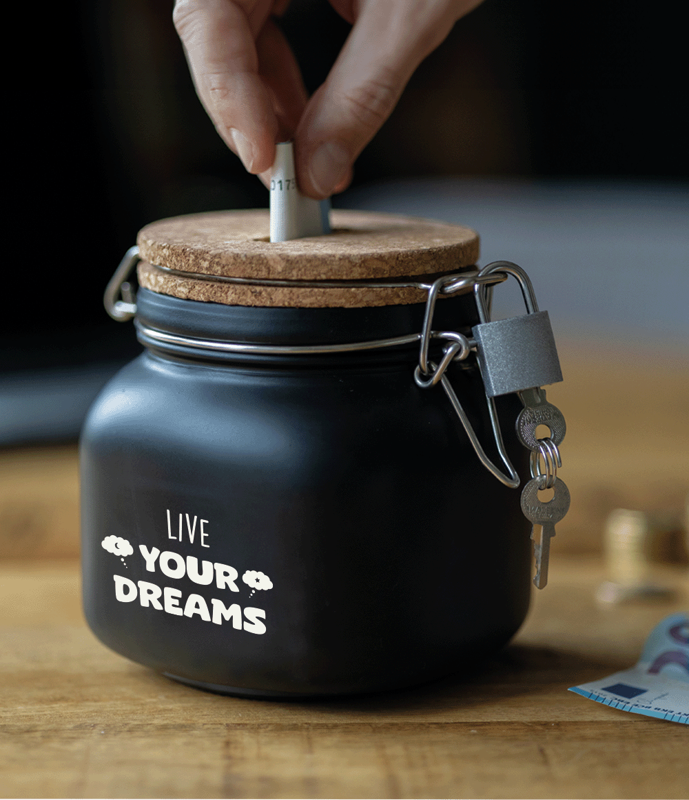 Sort sparebøsse Lev dine drømme 12,5 cm