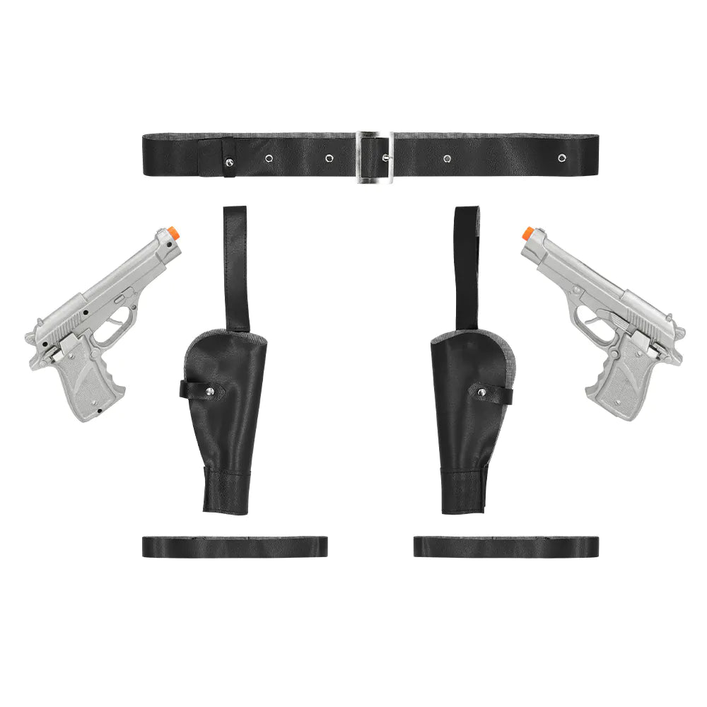 Uanset om du klæder dig ud som en barsk eventyrer eller heroisk politibetjent, har dette komplette hylstersæt alle de elementer, der skal til for at fuldende outfittet. Sættet indeholder bælte, benremme, 2 hylstre og 2 sølvfarvede legetøjspistoler. Perfekt til cosplay, karneval eller temafestkostumer.