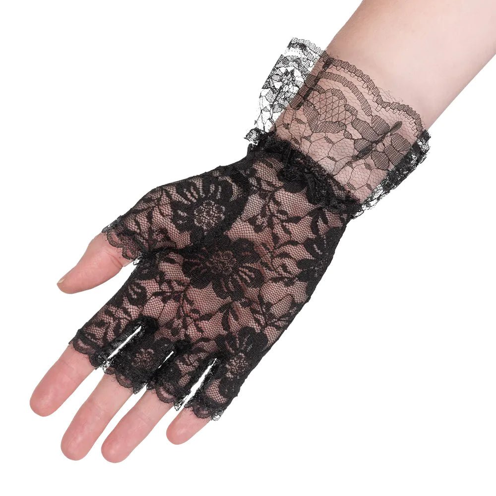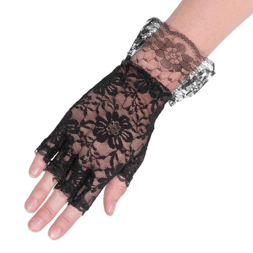 Disse elegante fingerløse blondehandsker er perfekte til at fuldende et 1920'er-flapperkostume til perfektion. De smukke sorte blonder giver handskerne et vintage glamour-look inspireret af de brølende tyveres charleston-stil.