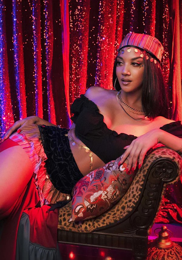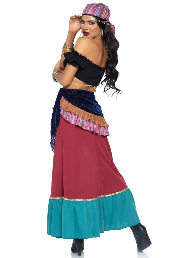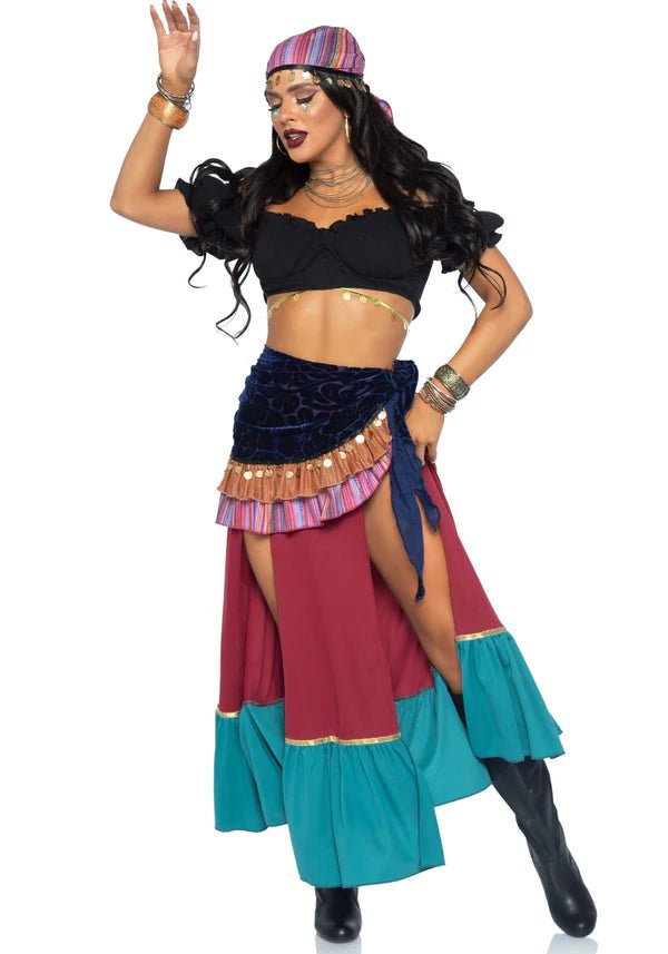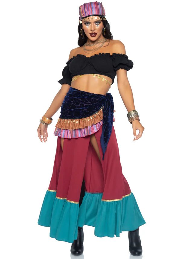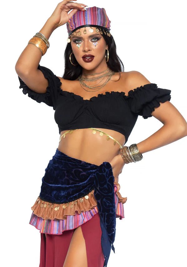 Frigør magien i dette 3-delte Crystal Ball Beauty-kostume fra Leg Avenue! Dette sexede zigeuneress-kostume består af en beskåret top med tørklæde pyntet med mønter, en nederdel med dobbelt slids og et fløjlsskærf med flæser. Perfekt til halloween, karneval eller andre temafester, hvor du vil vise din magiske side! 💫🌙