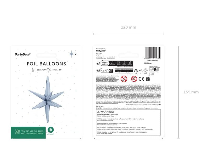 Folieballon med frostet 3D-stjerne i tågeblå, mål før opblæsning ca. 53 x 62 cm (21 x 24''), mål efter opblæsning ca. 50 cm (20''). Pustes op med luft. Sættet indeholder sugerør.
