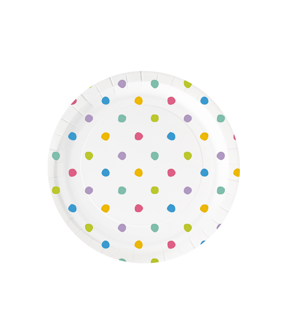 Fuldend festbordet med disse muntre Party Dots-tallerkener! Det legende prikmønster skaber øjeblikkelig feststemning og gør tallerkenerne perfekte til kager, snacks, godbidder og meget mere.