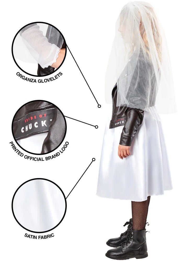 Lad din lille gyserfan forvandle sig til Tiffany, den berygtede Bride of Chucky. Med dette komplette sæt, der omfatter kjole med påsat jakke, slør og handsker, er de i huden på den ikoniske dukke fra den berømte filmserie på få sekunder. Ekstra sjovt: Kombiner det med matchende Chucky- og Tiffany-kostumer til hele familien, fra småbørn til voksne.