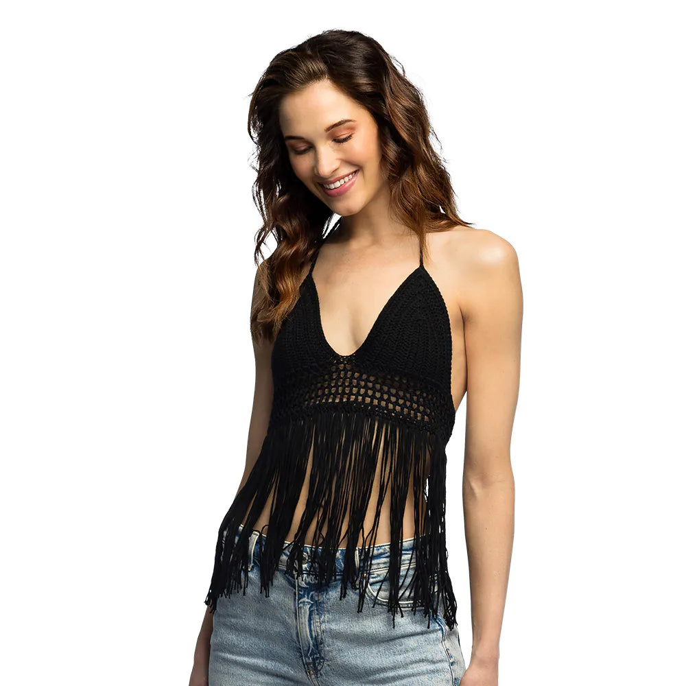 Lad solen skinne med denne søde sorte hæklede top i størrelse M! Det dekorative mønster i midten og de legende frynser i bunden giver toppen et ægte boho-look. Perfekt som blikfang til festivaler, strandfester eller en solrig dag i byen.