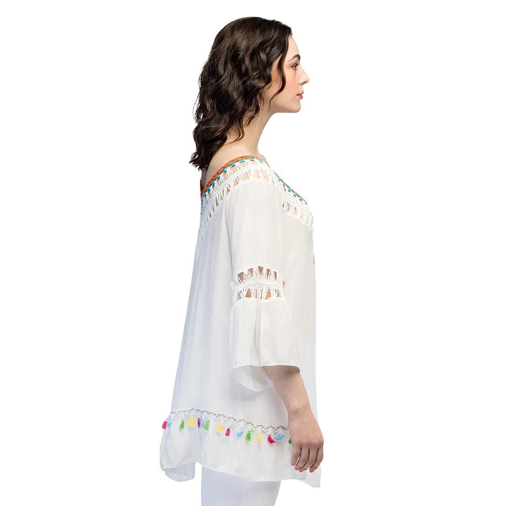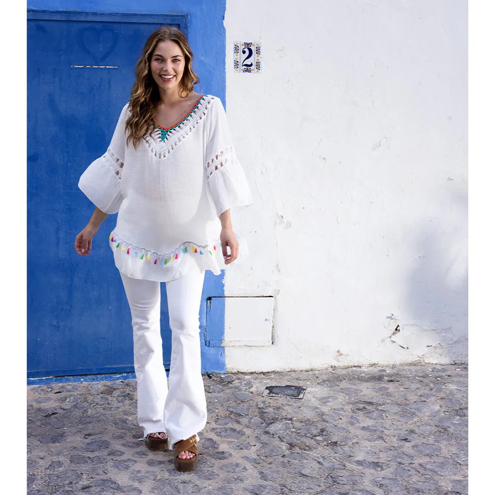 Denne sommerhvide tunika er ideel til en afslappende dag på stranden, en slentretur i byen eller som et boho-outfit til en sommerfestival. Det luftige stof sikrer en behagelig pasform, og de farverige detaljer langs halsudskæringen og bunden gør tunikaen endnu mere sommerlig. Fås i en standardstørrelse til kvinder.