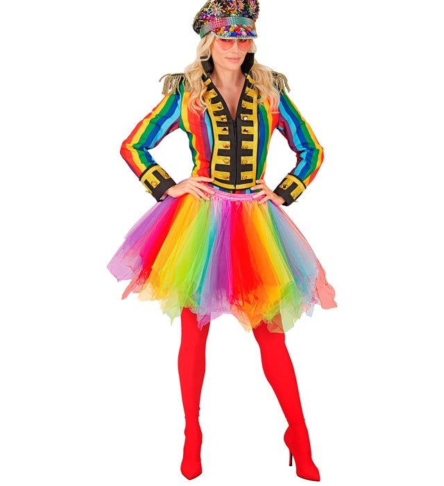 Denne regnbue-tutu skaber øjeblikkeligt et muntert og iøjnefaldende look og er perfekt til festlige og farverige lejligheder.