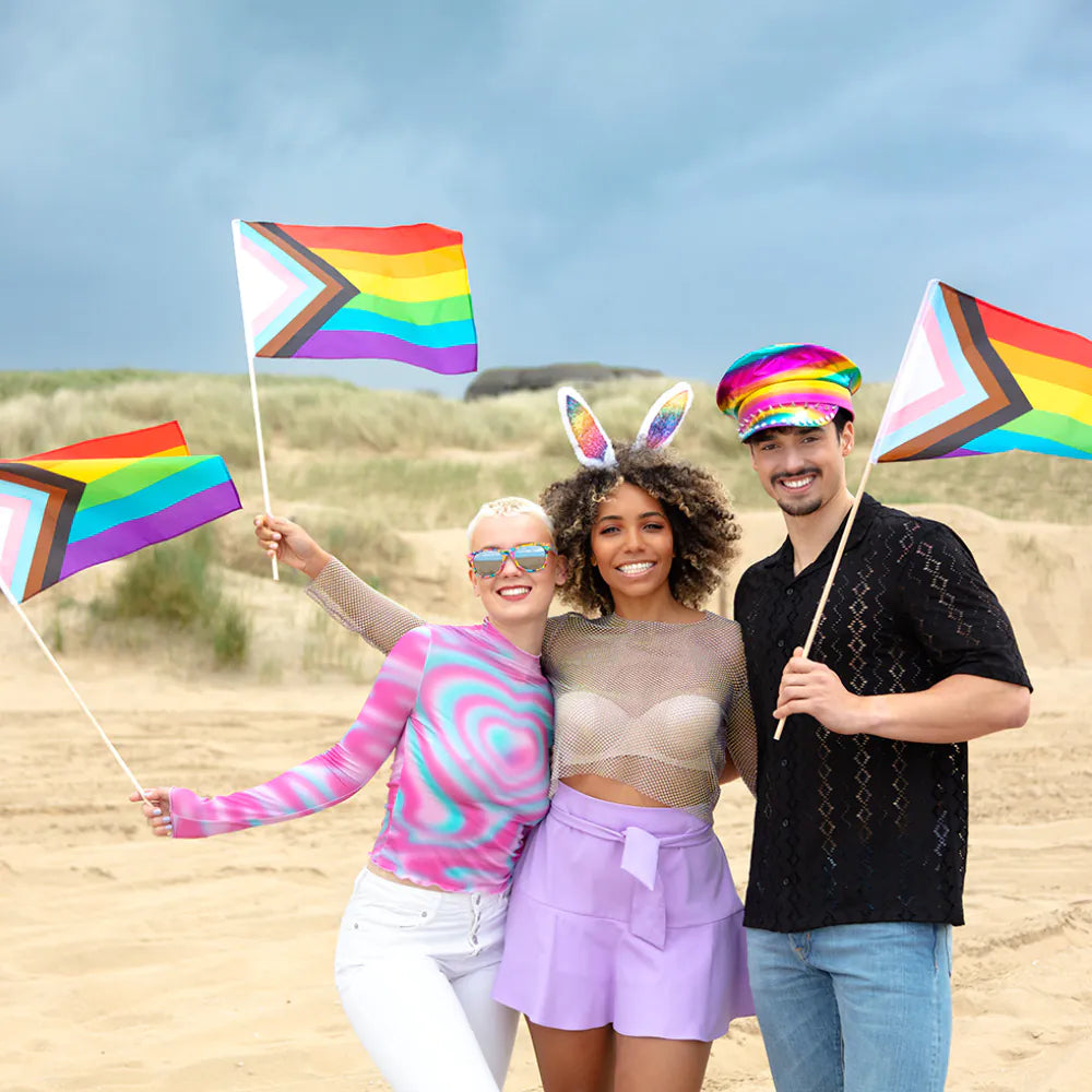 Et farverigt viftende polyesterflag med Progress-design. Håndflaget i polyester måler 30 x 45 cm og symboliserer inklusivitet og fremskridt. Flot at vifte med under Pride for at støtte LGBTQ+-miljøet.